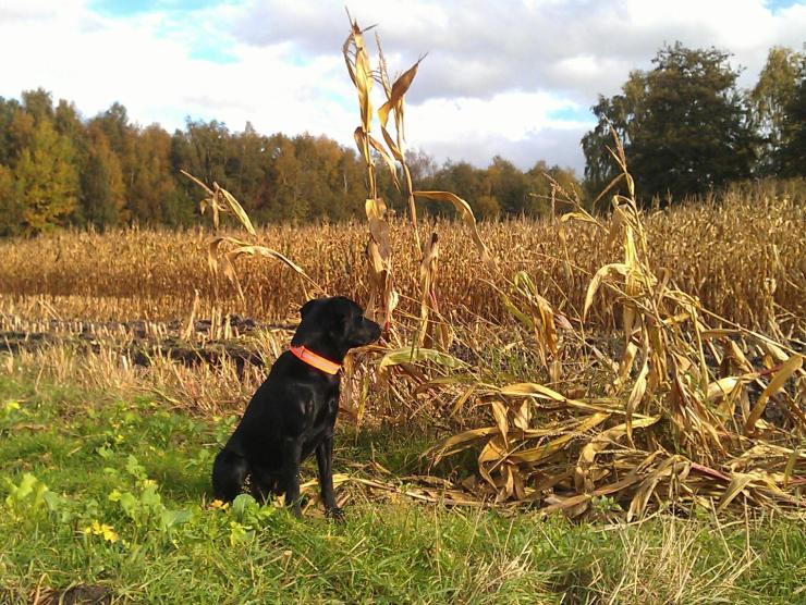 Ik draai me om en op het tweede schot valt hij in de gele mosterd die daar zeker 1.80 meter hoog staat. Ik denk: “Oei, dat is Joy niet gewend.” “Apport”, en weg is ’t ie. Hij is ook gelijk uit het zicht.